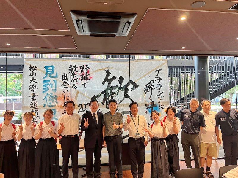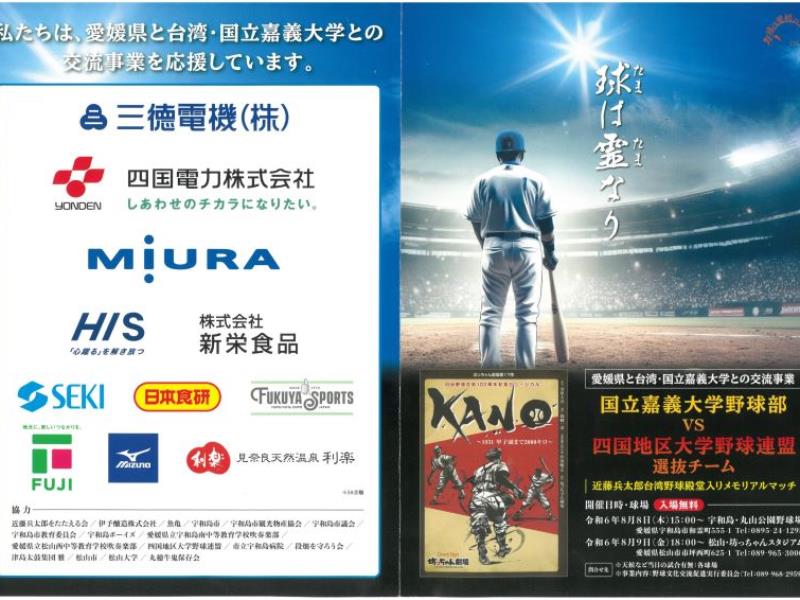 應愛媛縣邀請,嘉大棒球隊8月7日赴日參加紀念松山市近藤兵太郎教練的棒球交流活動,當日在少爺劇場觀賞《KANO》音樂劇(改編自嘉農棒球隊近藤兵太郎教練的真實故事),並至松山大學參加臺日棒球交流峰會,與四國大學棒球聯盟聯隊球員相見歡。交流峰會中,松山大學書法社用日文及中文寫下歡迎臺灣來訪的賀詞,嘉大鍾宇政總教練提到“日本棒球的靈魂是臺灣棒球應該學習的”,四國地區大學棒球聯盟則表達擴大臺日棒球交流及開放球員留學及打球的期望。
