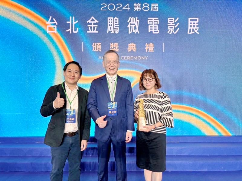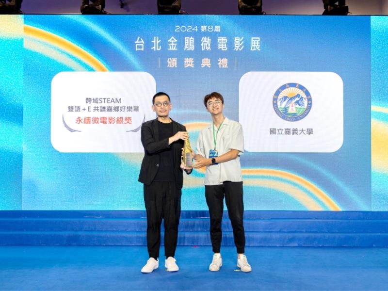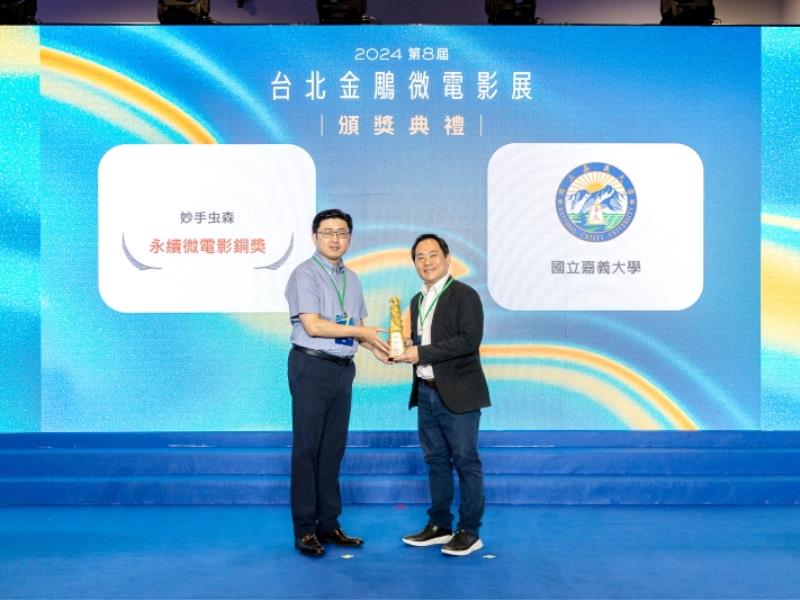 永續涵蓋面向廣而複雜,看似遙不可及卻又與我們未來息息相關。為帶領大眾探索永續的多樣貌,台灣永續能源研究基金會辦理「2024第八屆台北金鵰微電影展」,鼓勵各級單位以嶄新、視覺化的影像方式傳播永續教育內涵與成果,發揮社會影響力。「2024第八屆台北金鵰微電影展」全臺共有183部作品參賽,嘉大參賽的2件作品表現優異,獲得評審團的高度肯定。其中,「跨域STEAM雙語+E 共譜嘉鄉好樂章」USR計畫團隊的《偏鄉不偏鄉,嘉義我來擔。AI在地化,+E我來畫》作品,榮獲「永續微電影獎」銀獎殊榮,由參與計畫的電子物理學系學生李詠瀚代表受獎;「妙手虫森」USR Hub計畫團隊的《城鄉共生,生態相伴,重新思考與自然共存的方式》作品,榮獲「永續微電影獎」銅獎,由計畫主持人農學院江彥政副院長代表受獎。