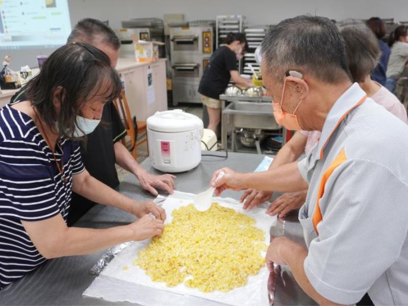 圖1:學員將蒸熟的小米鋪平並把小麴粉均勻撒上