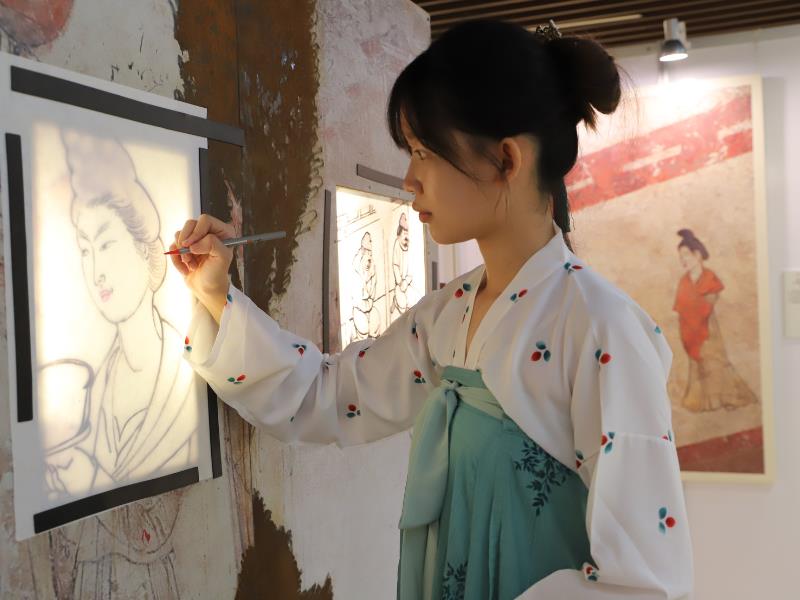 「盛世壁藏」唐代壁畫特展於南華大學率先登場,現場設置周邊活動,學生體驗壁畫臨摹。