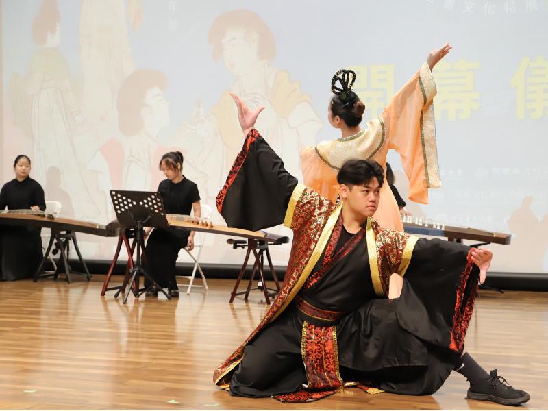 「盛世壁藏」唐代壁畫特展於南華大學率先登場,民族音樂學系學生以國樂演奏的樂舞表演展開序幕。