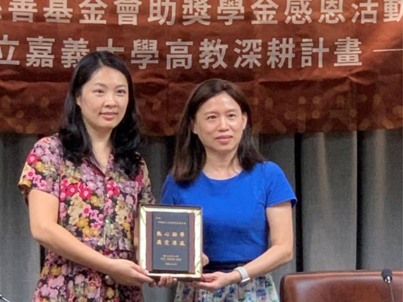 圖10:嘉大劉怡文副學務長致贈感謝獎牌給廣源慈善基金會宋美芬執行長(左)
