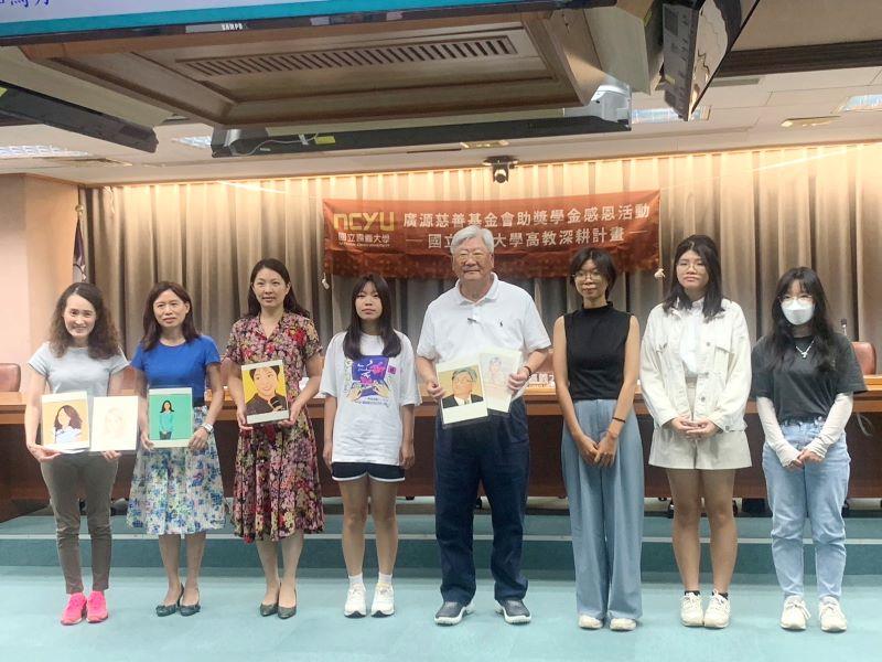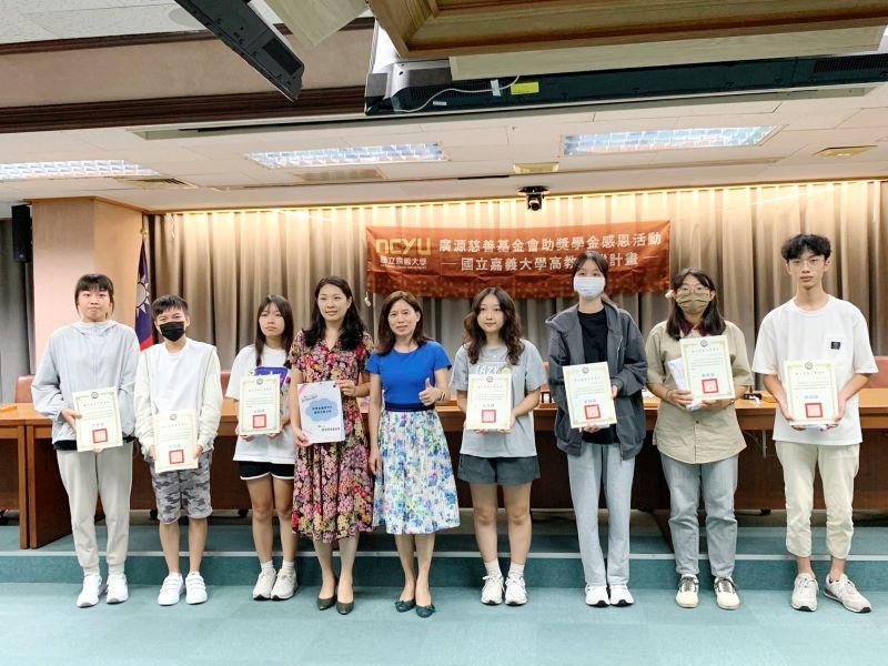 圖2:廣源慈善基金會宋美芬執行長(左4)與嘉大劉怡文副學務長(中)頒發獎狀給成績優秀的7位學生