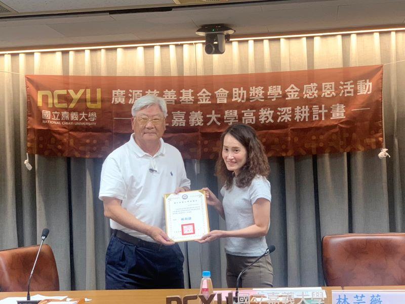 圖9:嘉大林芸薇主任秘書致贈感謝狀給蔡篤恭董事長(左)