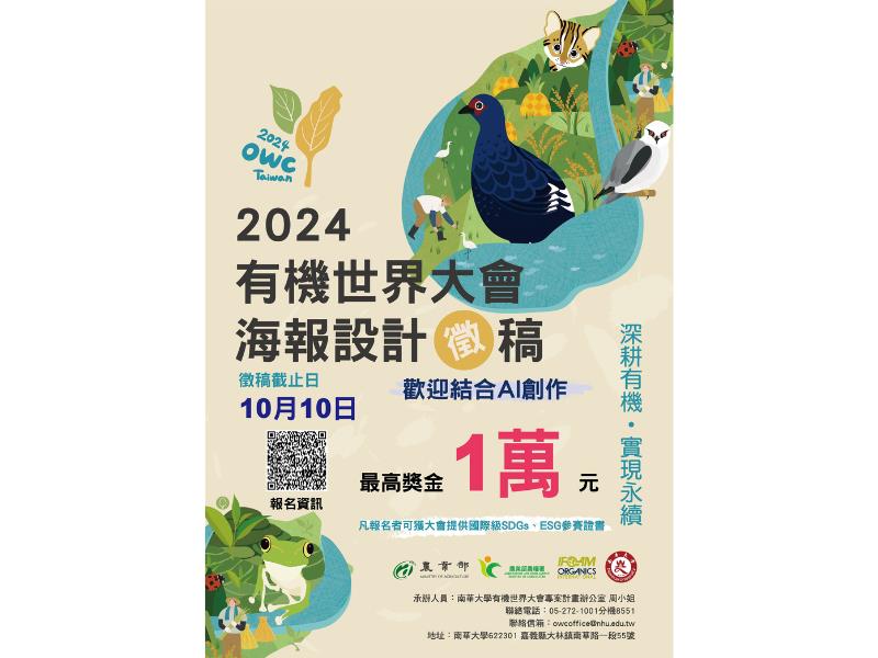 首次在台灣舉辦的「2024年有機世界大會」將於11月30日至12月6日在南華大學登場,迄今已接獲逾200篇論文投稿,此為國內一大盛事,期透過產、官、學之合作,讓臺灣有機成果分享到全世界。因此特別配合大會主題「深耕有機‧實現永續」舉辦海報創意競賽,邀請全國高中職及大專校院學生參賽,報名時間至10月10日。獲獎作品將於大會官網線上展出,讓創意成果躍上國際舞台,最高獎金一萬元。此外,大會活動期間將設置有機市集,歡迎有機或友善耕作之業者一同共襄盛舉。