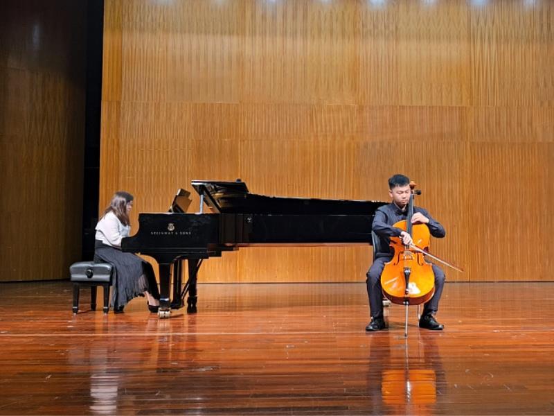 圖/中華大學許恩瑞同學在舞台上演奏大提琴,與浙江湖州師範學院音樂學院的學生進行音樂交流。