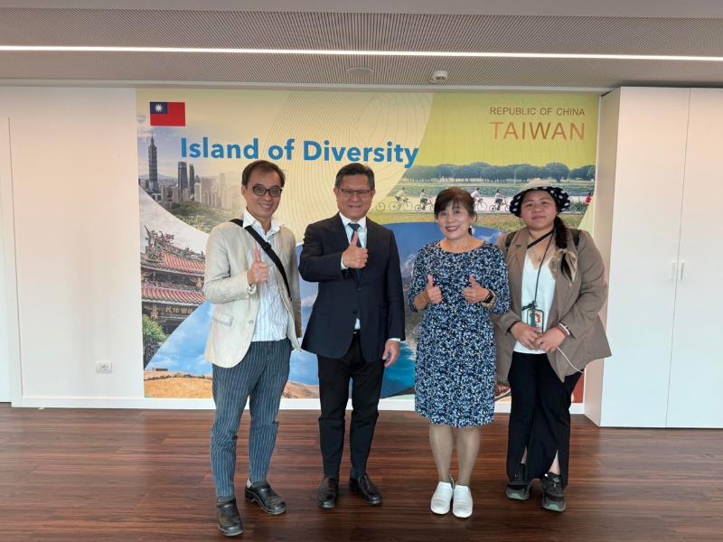 南華大學USR計畫協助雲林良品走向世界,USR計畫葉月嬌執行長(右2)帶領梁毅宗教授(左1)、USR計畫專案副理黃珮瑄(右1),拜會駐米蘭台北辦事處林讚南處長(左2) ,分享本次交流成果與未來發展。