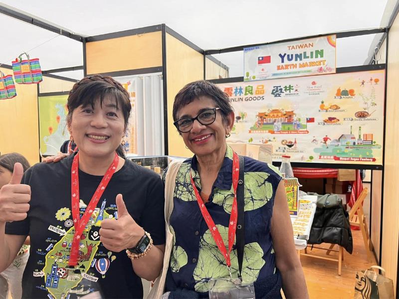 南華大學USR計畫協助雲林良品走向世界,南華大學USR葉月嬌執行長(左)與澳洲地球市集AmorelleGeorgiaAugustaDEMPSTER(右)討論雲林地球市集未來發展。