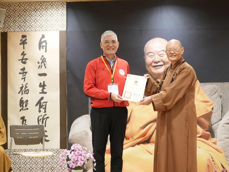 南華大學舉辦【見真東渡】禪式管理領袖生命提升營,高俊雄校長(左)致贈感謝狀予佛光山日本總住持滿潤法師(右)。