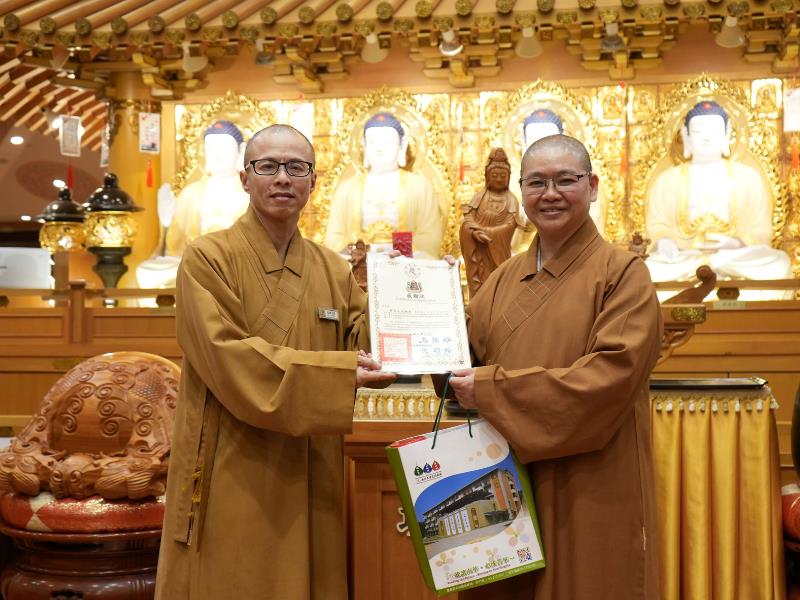 南華大學舉辦【見真東渡】禪式管理領袖生命提升營,結業式由釋知賢院長(左)致贈感謝狀予佛光山本栖寺監院覺勝法師(右)。