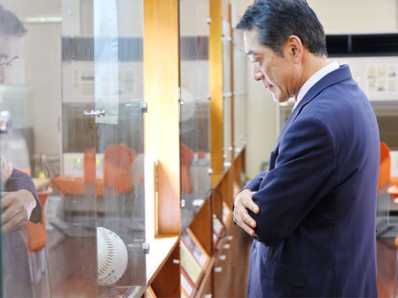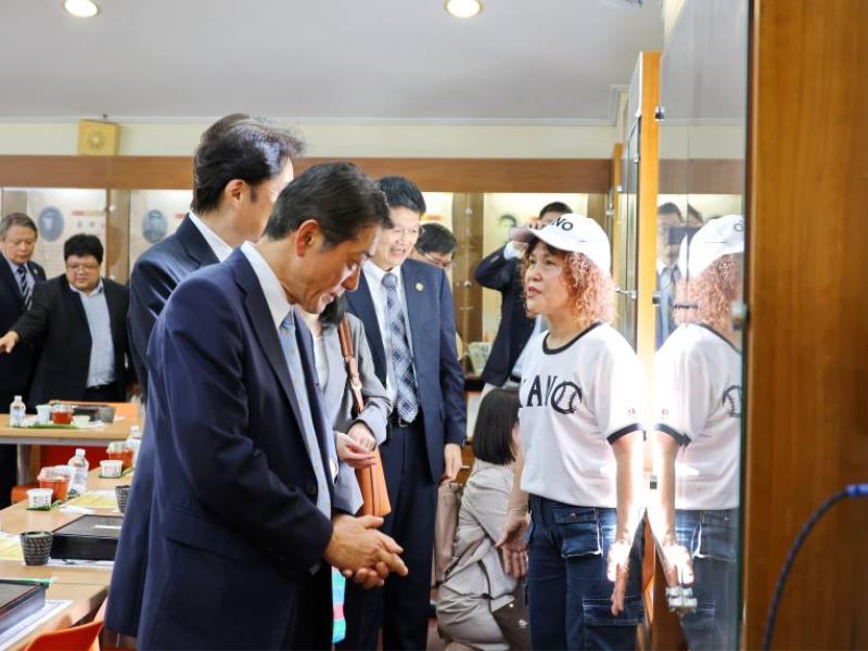 圖5:日本愛媛縣知事中村時?參觀嘉大蘭潭校區合作社二樓《KANO》棒球特展(常設展)
