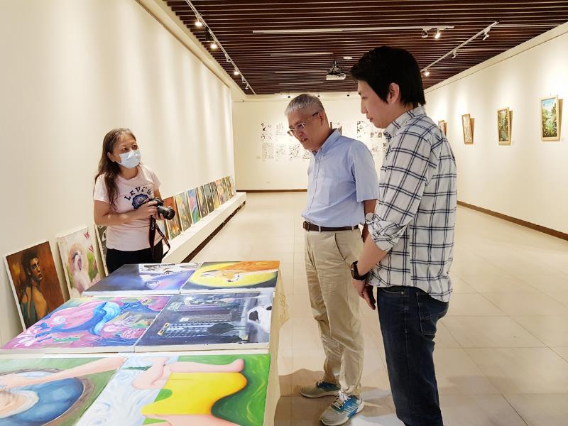 南華大學視設系培育珍珠學生,激發創作潛力,舉辦成果展覽,左起視設系李孟軒副主任、高俊雄校長、賴淑玲副校長蒞臨參觀並合影。