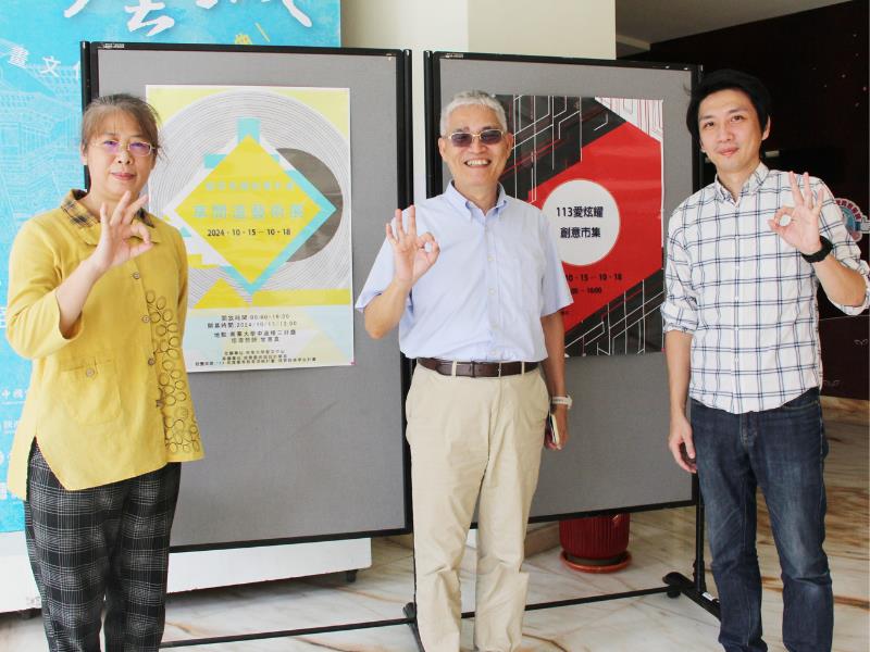 南華大學視設系培育珍珠學生,舉辦「植萃茶趣紀實計畫-草間道藝術展」及「113愛炫耀創意市集」展示。左起為視設系曾惠真老師、高俊雄校長、李孟軒副主任。