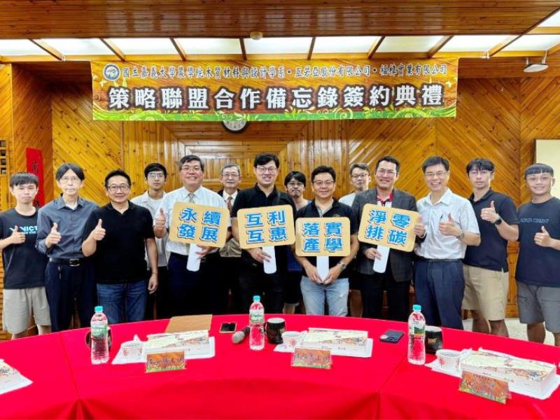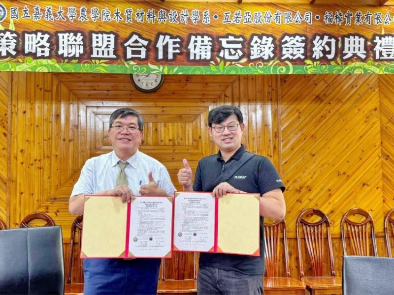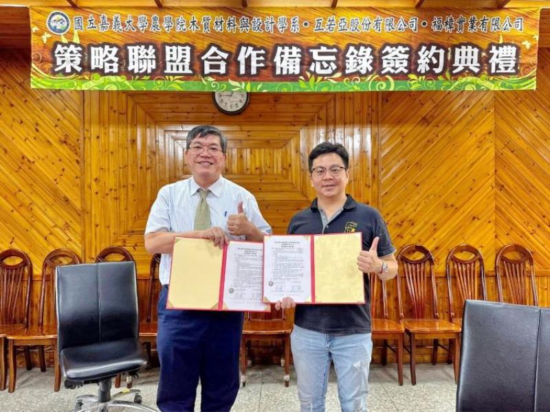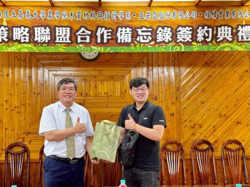 嘉義大學木質材料與設計學系為提供學生更多與業界接軌的實習機會,10月23日由木設系李安勝主任與互若亞股份有限公司周提總經理、福樟實業有限公司張元耀總經理共同簽署合作備忘錄,並邀請森林系李嶸泰主任及木設系師生共同參與見證,並以「互利互惠、落實產學、淨零碳排、永續發展」攜手建立友好的產學合作模式,創造學生畢業即可就業之契機。