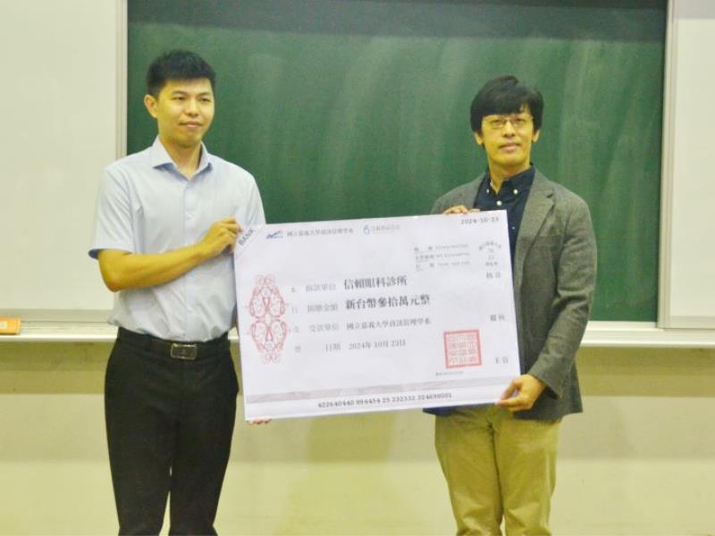 圖2:信賴眼科診所陳郁翔部長(左)代表賴麗如院長捐贈清寒學生獎助學金30萬元予嘉大資管系李彥賢主任(右)