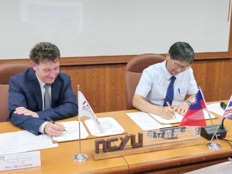 嘉義大學外國語言學系今(25)日與英國亞伯丁大學(University of Aberdeen)語言、文學、音樂與視覺文化學院正式簽署合作備忘錄(MOU),此次合作旨在促進兩校在學術研究、教育資源共享以及學生交換計畫上的深入交流,為雙方師生創造更多國際合作機會。