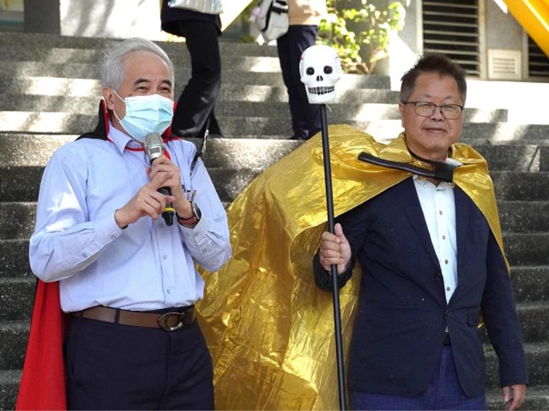 圖/中華大學副校長兼國際長解鴻年(右)與中華大學教務長兼國際專修部主任林育立(左)以奇裝異服融入學生活動。