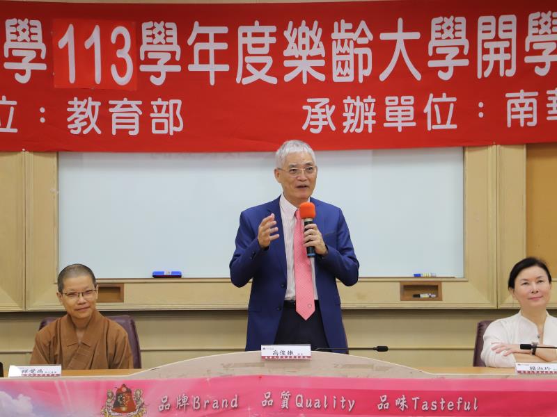 南華大學校長高俊雄致詞時表示,南華大學如同一個大家庭,讓各年齡層的學生都能在校園內學習、青銀共學。目前也將規劃宿舍區,讓長者們未來也能有機會住在學校學習,深度體驗大學生活,同時也勉勵學員多元學習,充實生活。