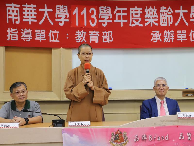 南華大學終身學習學院樂齡大學開學,駐校董事覺禹法師致詞。