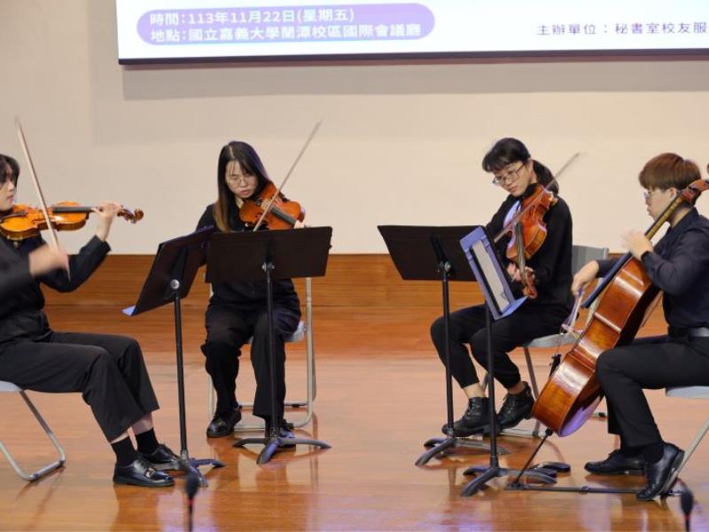 優雅絃樂聲中拉開活動序幕,此次共有來自全臺各地150多位校友及退休師長熱情回「嘉」參與。嘉大張俊賢副校長表示,自己也是嘉師畢業,此次籌辦校(園)長的校友回娘家活動,除讓校友了解母校近年來的發展、凝聚校友對母校的情感,更藉由全臺各地校友難得齊聚一堂時,建立相互支援的網絡。