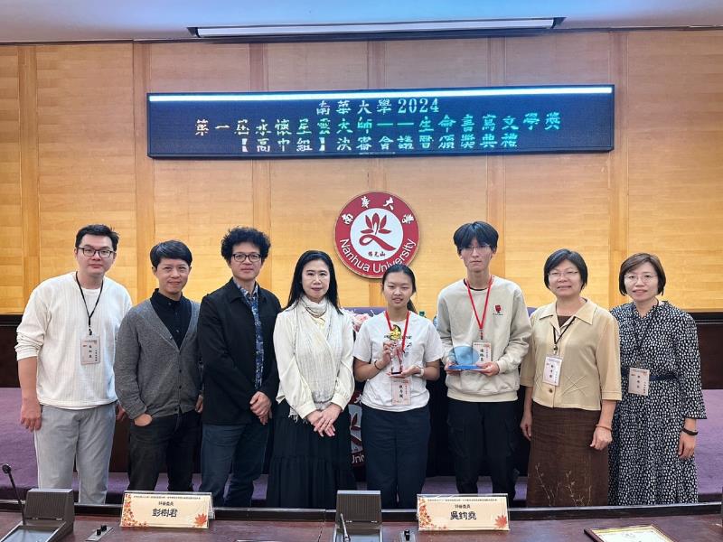 南華大學舉辦「永懷星雲大師生命書寫文學獎」決審會議暨頒獎典禮,高中組獲獎者與評審及南華大學文學系師長合影。