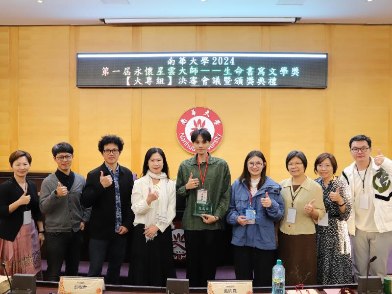 南華大學舉辦「永懷星雲大師生命書寫文學獎」決審會議暨頒獎典禮,大專組獲獎者與評審及南華大學文學系師長合影。