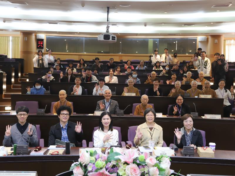 南華大學舉辦「永懷星雲大師生命書寫文學獎」決審會議暨頒獎典禮,董事長慈惠法師(第二排右2)特別親臨會場勉勵學子並一同合影。