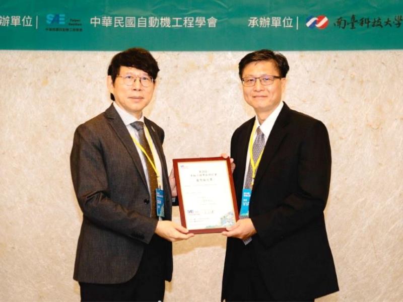 圖3:嘉大機械系張烔堡特聘教授(右)榮獲「車輛工程全國學術研討會」優秀論文獎,由車輛研究測試中心王正健董事長頒獎
