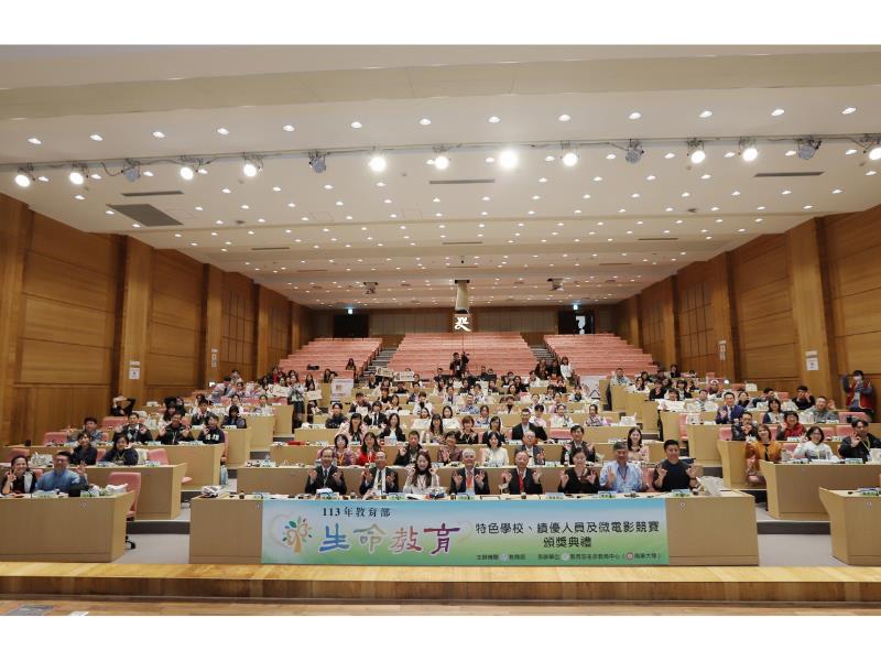 教育部舉辦113年教育部生命教育特色學校、績優人員及微電影競賽頒獎典禮,現場大合照。