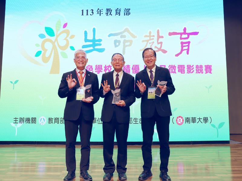 教育部於12月13日辦理「113年教育部生命教育特色學校、績優人員及微電影競賽頒獎典禮」。本次獲表揚計有1位終身奉獻人員、1位特殊貢獻人員、8位績優人員及7所特色學校(包括大專校院2所、高級中等學校1所、國中1所及國小3所),並於現場揭曉微電影得獎團隊,本次微電影競賽共計38件參賽,從17部入圍影片中,選出2名佳作及金銀銅牌等5個獎項。由教育部學生事務及特殊教育司副司長許嘉倩擔任本次典禮頒獎人。深耕生命教育、邁向永續發展的南華大學,今(113)年不僅是第五度獲頒「生命教育特色學校」,退休副校長林辰璋亦獲頒「生命教育特殊貢獻人員獎」,名譽校長林聰明更獲頒「終身奉獻人員獎」,此為該獎項最高榮譽,足見該校多年來推動生命教育不遺餘力,且成效深獲肯定。
