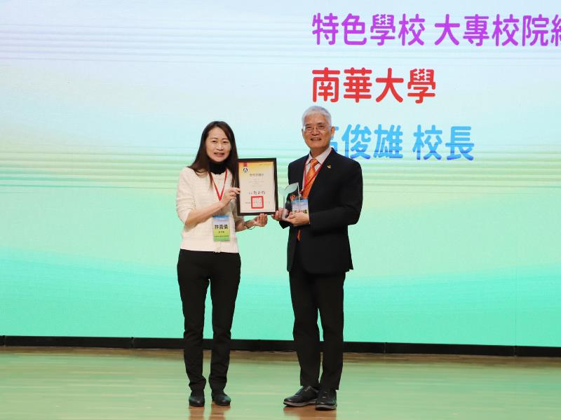 南華大學第五度獲生命教育特色學校,由教育部學生事務及特殊教育司副司長許嘉倩(左)頒發獎杯及獎狀予高俊雄校長(右)。