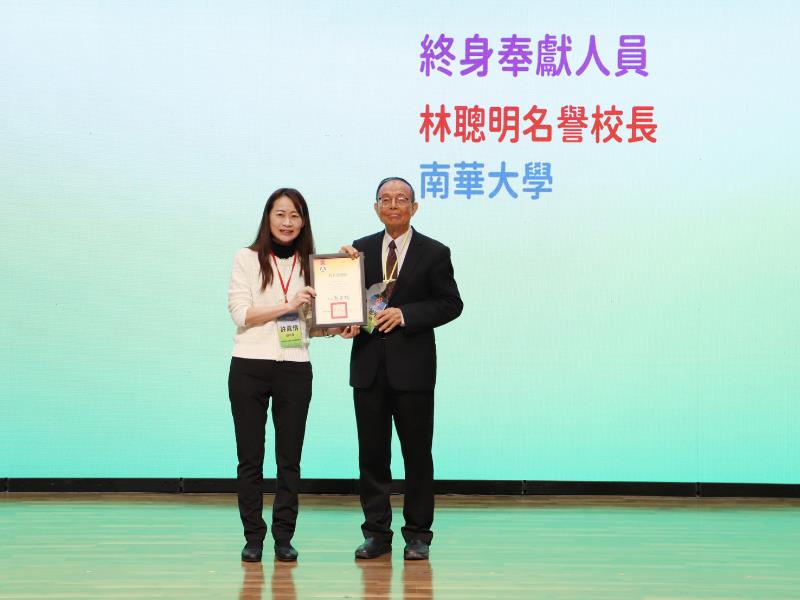 生命教育頒獎典禮南華大學獲三大獎,名譽校長林聰明(右)獲頒「終身奉獻人員獎」。
