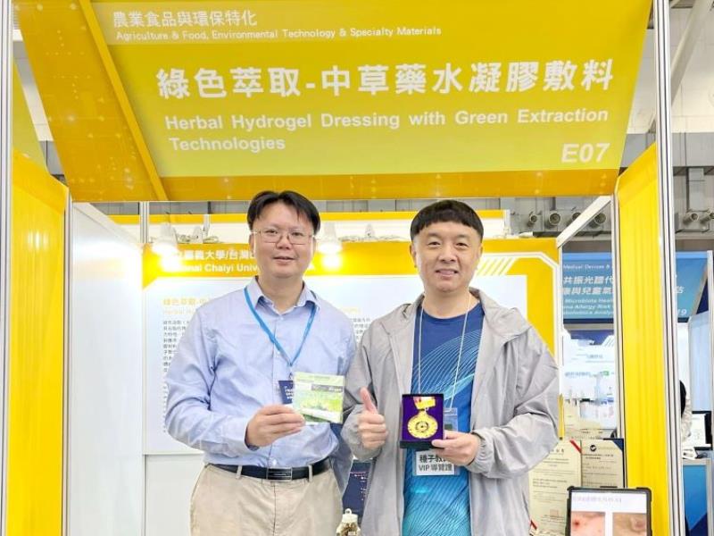 嘉大團隊利用蘭潭校區原生藥用植物園中所栽種的中草藥,開發出多種綠色化學醫材原料,應用於無刺激性傷口液體繃帶、抗痘敷料、抗真菌敷料及舒緩痠痛的液體貼布等產品。此技術不僅使用後無廢棄物產生,更溫和無刺激,適合嬰兒及幼童使用,並具有卓越的保濕、傷口保護及抗發炎功效,目前已向臺灣、日本、美國及歐盟申請相關醫材認證,並積極與日本、義大利及西班牙等藥廠洽談技術合作。