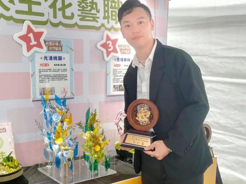 嘉義大學園藝學系大三袁仕華同學,近期榮獲「桃園薪傳 技得藝滿」113年技藝推廣暨達人表揚活動「永生花藝職類」第1名,並受邀參與2024士林官邸菊展布展,展現其在花藝上的專業技能與設計巧思,是大學「特殊選才」管道的優秀典範。