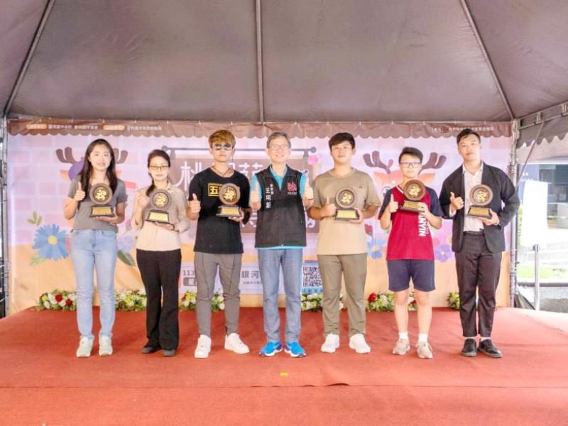 圖3:桃園市113年技藝推廣暨達人表揚活動王明鉅副市長(中)與嘉大園藝系袁仕華同學(右一)等獲獎人合影