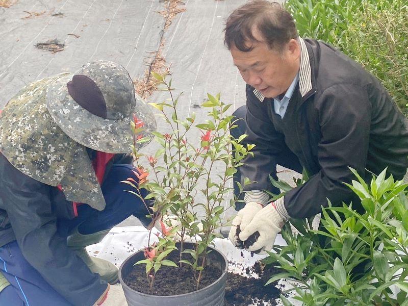 圖3:嘉大森林系何坤益教授(右)指導好美里居民種植適合當地環境的植栽赤楠