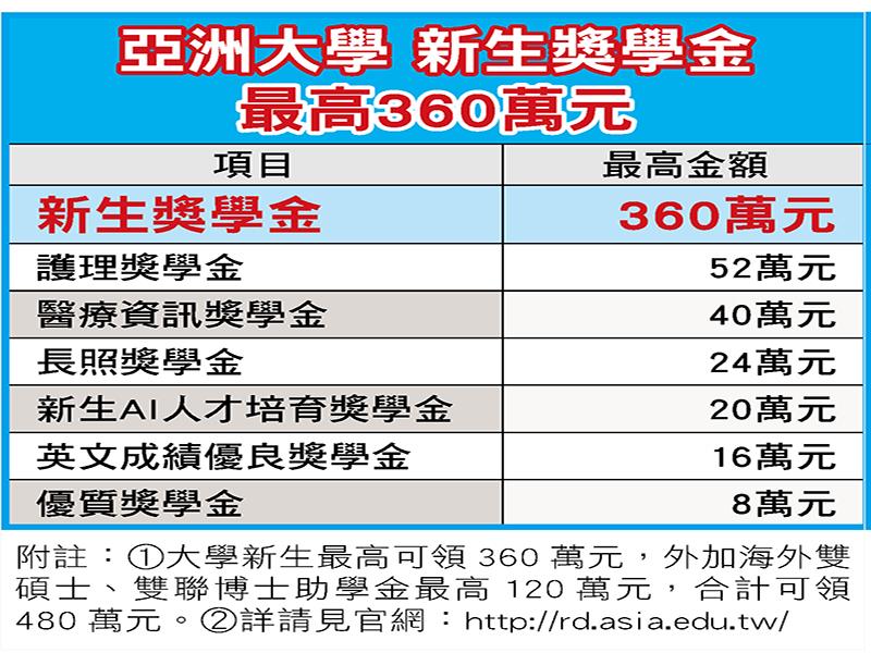 亞洲大學為投入AI智慧醫療大健康產業,提出豐厚獎學金計畫吸引優秀人才,除了新生獎學金最高360萬元外,今年再加碼「優質獎學金」,只要學測成績英文前標及任1科均標者,每年2萬元、4年8萬元獎學金,加上教育部補助的3.5萬元,學雜費低於國立大學。