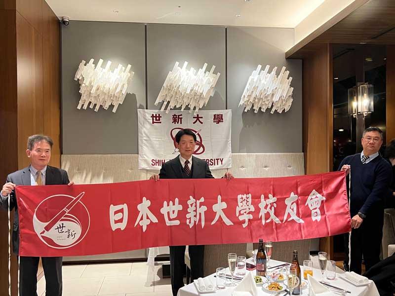 校友總會理事長陳錦祥(左一)致贈具象徵意義的校友會橫幅,為日本校友會送上祝福,期待未來發展多元且蓬勃