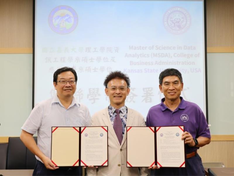 應用數學系與資訊工程學系於113年12月24日分別與美國堪薩斯州立大學管理學院簽署完成1+1雙聯學位協議。未來學生可申請修讀碩士雙聯學位,畢業同時可取得嘉大及美國堪薩斯州立大學雙碩士學位。