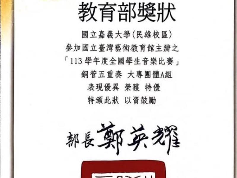 嘉大音樂系銅管五重奏榮獲113學年度全國學生音樂比賽大專團體A組特優 收藏