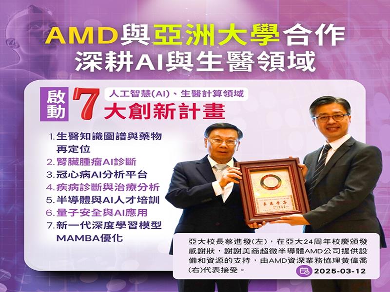 亞洲大學多年培育AI半導體高階人才有成,AMD公司在亞大成立「AMD邏輯及運算實驗室」和提供資源。亞大校長蔡進發表示,亞大在AI、半導體領域耕耘多年,近年來推動產學合作,積極培養AI半導體高階人才,更於亞大24周年校慶這一天,宣布雙方將啟動人工智慧(AI)、生醫計算領域的「七大創新計畫」,涵蓋生醫知識圖譜與藥物再定位、腎臟腫瘤AI診斷、冠心病AI分析平台、疾病診斷與治療分析、半導體與AI人才培訓、量子安全與AI應用、新一代深度學習模型MAMBA優化,透過高效能運算資源,大幅提升AI在生醫領域的應用能力,推動精準醫療與高效能運算發展,以培育更多台灣AI科技、生醫領域人才。