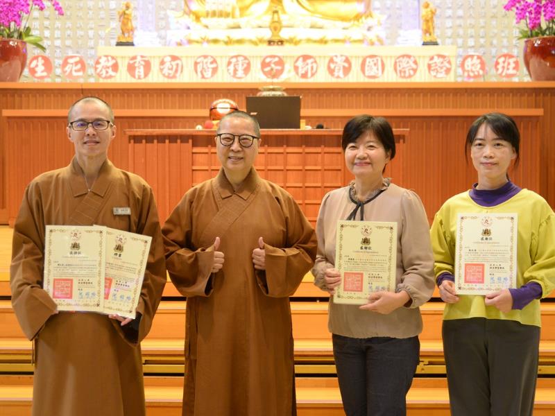 佛光山南台別院社教監寺知天法師(左二)與釋知賢教授(左一)、郭慧娟老師(右一)共同頒發生死教育初階種子師資國際證照予台灣第一位女法醫尹莘玲(右二)恭喜一家四口通過考試成為生死教育初階種子師資。