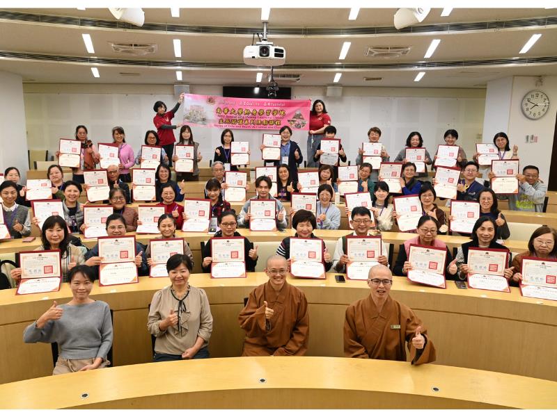 釋知賢於結業式鼓勵學員:「培訓課程及考取證照是一時,生死教育卻是生生世世。初階課程結業後,未來還有中階、高階課程,期許大家成?真正生死教育推廣師。有理論學習,更要實際行動,終身學習學院將提供實習平台,以利開始起步,實際成為向社會大眾落實推廣生死觀念的人間菩薩。」
