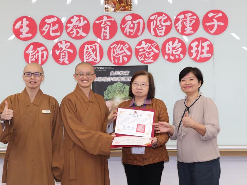 近50位學員帶著歡喜和利人利己的心,通過考試完成「生死教育初階種子師資國際證照課程」的學習,獲頒「南華大學終身學院研習證書」和「生死教育初階種子師資國際證照」雙證書,並期許未來中階及高階師資班能再續共學之緣。