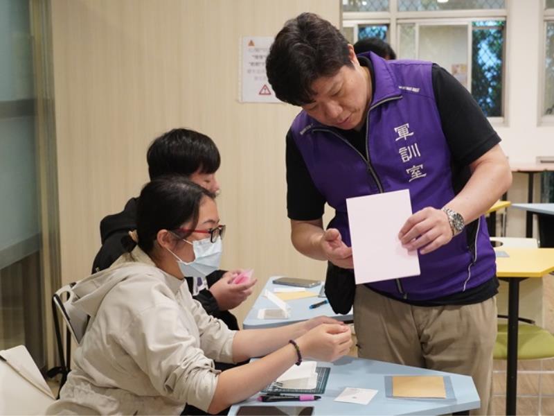 圖/軍訓室每年協助學子舉辦多元活動提升五育學習;教官劉德慶細心說明卡片製作方式。
