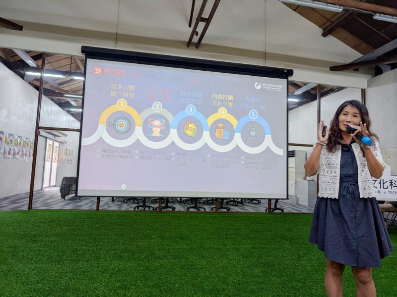 南華大學國企學程參訪嘉義文化科技創新基地,臺灣元宇宙新媒體科技產業發展協會理事長鄒淑文說明AI 科技於廣告行銷的應用。