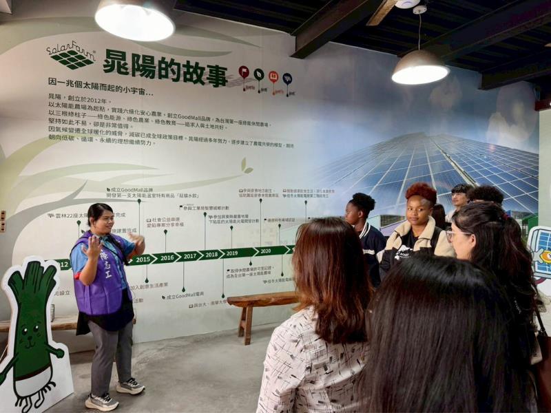 一到雲林晁陽農產科技公司,占地12公頃的太陽能農電園區,學生即被成排高聳的太陽能溫室與綠意盎然的農田所震撼。晁陽是台灣唯一通過農電共生審核的場域,成功將「發電」與「農作」結合,打造綠碳農業的創新典範。導覽人員詳細解說太陽能板下如何種植菇類、黑木耳與高價值生薑,並展示智慧農業感測器時時監測溫濕度與水質,大大提升農作效率與品質。晁陽不僅強調能源永續,更落實「六級化農業」一條龍運作模式,從生產、加工、品牌到電商銷售皆一手掌握。學生走進「Good Mall」品牌展區,更從參訪中學習農產品如何透過品牌包裝與數位行銷轉化為高附加價值商品。此營運邏輯不僅創造經濟效益,與南華大學尤努斯中心所提倡的「零碳排」與「創新創業解決社會問題」的核心精神不謀而合。