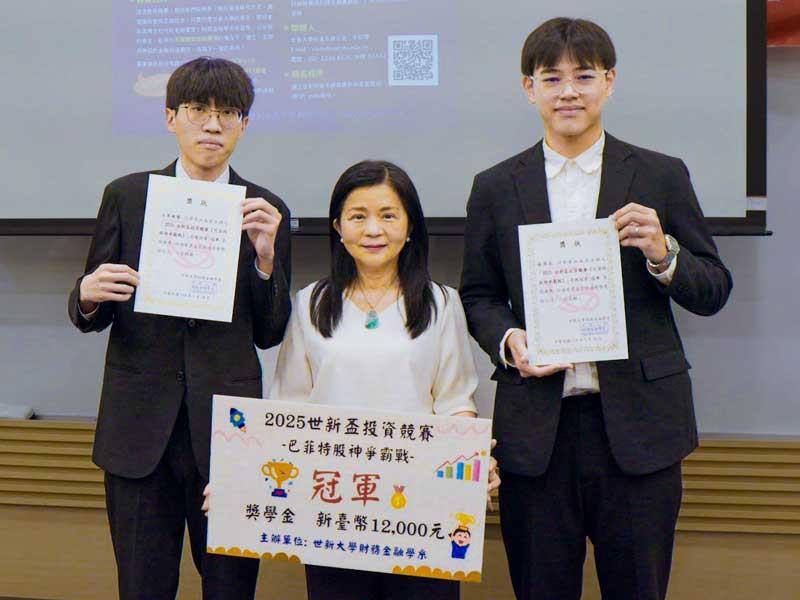 世新財金系王李峻豫(左)、林羿辰(右)榮獲《巴菲特股神爭霸戰》冠軍,由財金系主任吳秋慧(中)頒獎