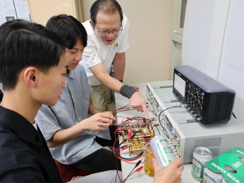 圖1:嘉大電機系江政達教授(右)指導學生沈雋詠及陳冠宏,研發出以電導法為基礎的「啤酒新鮮度偵測器」。