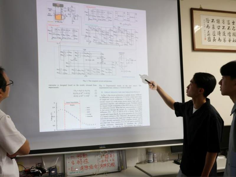 沈雋詠與陳冠宏同學表示,目前市面上雖有伏安法、比色法、HPLC與電子舌等量測技術,但多數方法操作繁複且成本高昂。相較之下,本次採用的電導法具備反應快速、設備要求低、製作成本低及操作簡易等優勢,並成功整合感測系統與CMOS積體電路製程,使偵測器可輸出晶片占空比之訊號,進一步推估啤酒放置時間,顯著提升偵測效率與準確度。